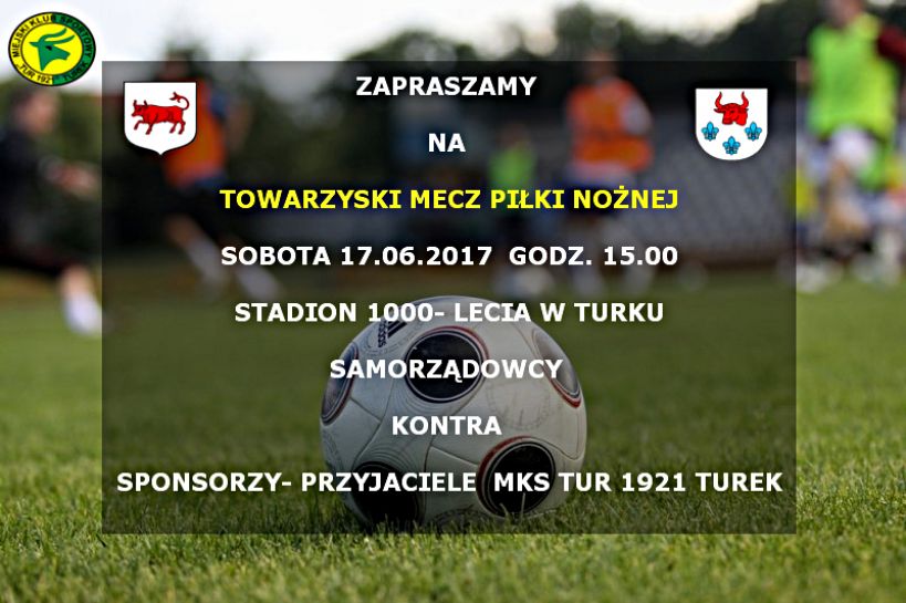 Zapraszamy na mecz piłki nożnej samorządowcy kontra sponsorzy i przyjaciele MKS Tur 1921 Turek. Spotkanie rozegrane zostanie w sobotę 17 czerwca, na stadionie 1000-lecia w Turku, o godz. 15:00.