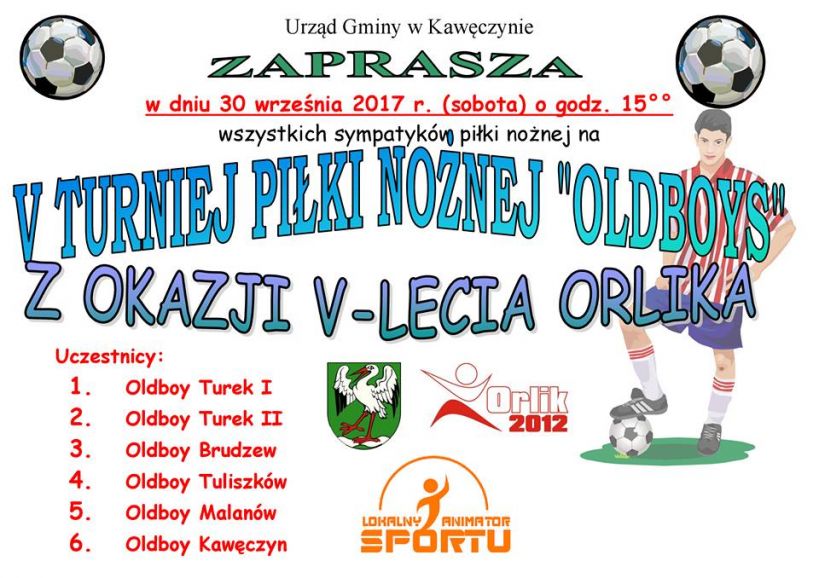 Urząd Gminy w Kawęczynie zaprasza wszystkich sympatyków futbolu na V Turniej Piłki Nożnej „Oldboys”. Wydarzenie to jest doskonałą okazją do świętowania 5-lecia Orlika. W rozgrywkach wezmą udział zawodnicy z Turku, Brudzewa, Tuliszkowa, Malanowa i oczywiście gospodarze z Kawęczyna. Początek zmagań zaplanowano na godz. 15:00.