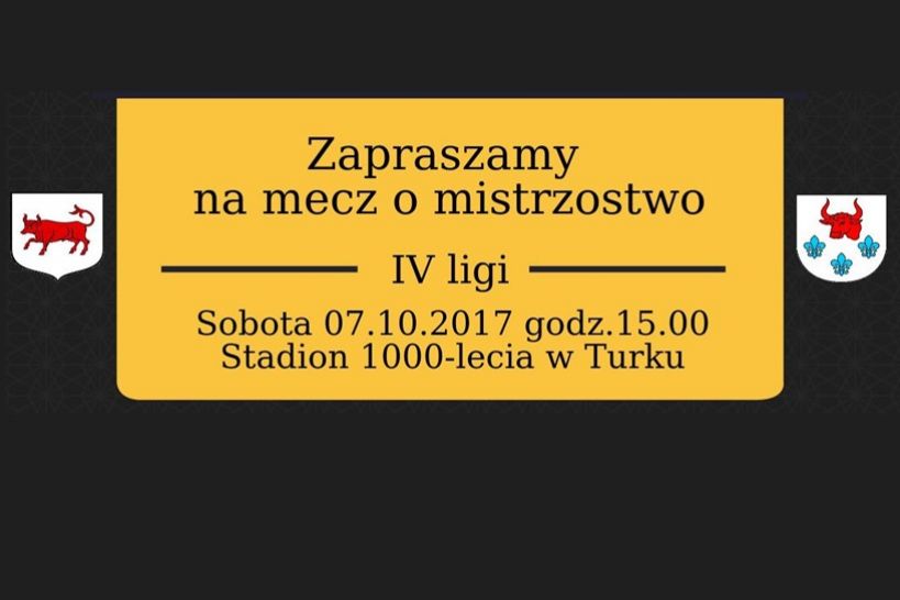 Zapraszamy na kolejny mecz piłki nożnej w ramach walki o mistrzostwo IV ligi. W sobotę 7 października na stadionie 1000-lecia w Turku zmierzą się MKS Tur 1921 Turek i Rawia Rawicz. Początek spotkania o godz. 15:00. W przerwie meczu przewidywany jest konkurs dla kibiców. Cena biletu to jedyne 6 zł, ulgowy 4 zł. Kobiety i dzieci do lat 13 – wstęp wolny.