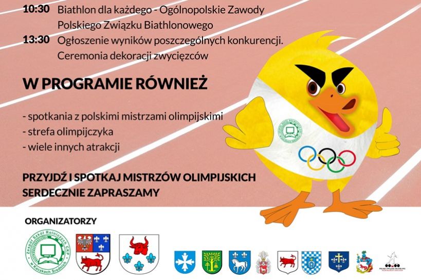 W jedynym miejscu w kraju, tym razem w Kaczkach Średnich usłyszeć można będzie znane z telewizji historie polskich sportowców, poczuć iście olimpijską atmosferę podczas ceremoniału otwarcia, kiedy to zapłonie znicz olimpijski, a flagi, w asyście medalistów Igrzysk Olimpijskich, wciągnięte zostaną na maszt. Ponadto na stadionie rozegrana zostanie iście olimpijska rywalizacja młodzieży ze wszystkich szkół naszego regionu w dyscyplinach lekkoatletycznych i nie tylko. Przewidziano również „Biathlon dla każdego” - ogólnopolską rywalizację na przełajowym torze ze strzelaniem na stanowiskach wyposażonych w laserowe karabinki biathlonowe, w której wziąć mogą udział uczniowie we wszystkich kategoriach wiekowych (szczegółowy regulamin i zapisy na: https://biathlon.com.pl/programy/biathlon-dla-kazdego/#1491895941889-5e5b9137-87d6). W programie głównym rywalizacja odbędzie się w kategoriach biegowych, pchnięciu kulą oraz skoku w dal wg harmonogramu: