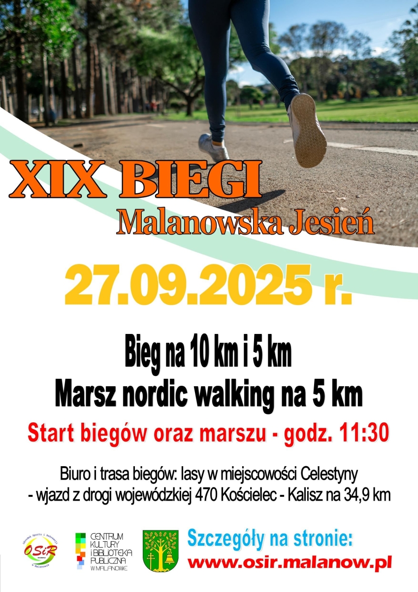Zapisy prowadzone są elektronicznie na stronie OSiR Malanów. To wydarzenie to nie tylko sportowa rywalizacja, ale też okazja do wspólnego spędzenia czasu w otoczeniu natury. XIX Biegi Uliczne „Malanowska Jesień” odbędą się 27 września w Celestynach (wjazd z drogi wojewódzkiej 470, 34,9 km trasy Kościelec–Kalisz).