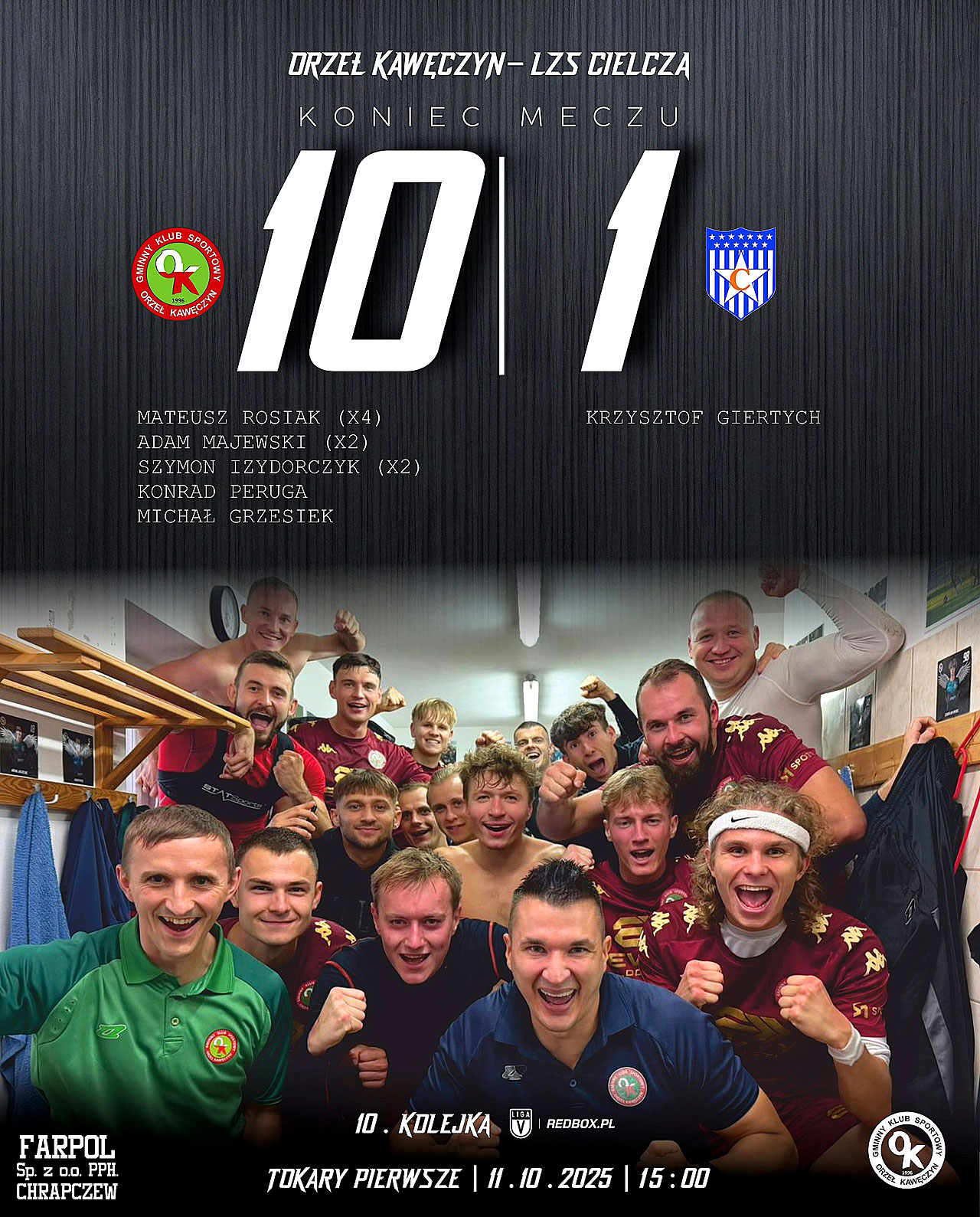 Na listę strzelców wpisali się: Mateusz Rosiak (4 gole), Adam Majewski (2), Szymon Izydorczyk (2), Konrad Peruga i Michał Grzesiek. Honorowe trafienie dla gości zdobył Krzysztof Giertych.