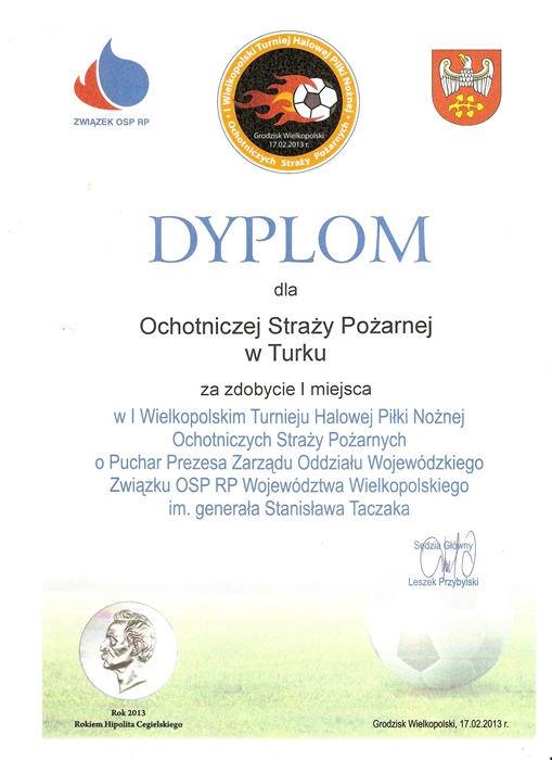 Zwycięstwo w Wojewódzkim Turnieju Halowej Piłki Nożnej Ochotniczych Straży Pożarnych wywalczyli: Maciej Janik, Daniel Zagozda, Bartłomiej Wojtczak, Dominik Rogodziński, Michał Wadelski, Marcin Pękacz, Konrad Buda, Janusz Modrzejewski, Przemysław Witkowski. Zawodnikom towarzyszyli: trener i kierownik drużyny – Zbigniew Rogodziński, jej opiekun - Henryk Świerk, a także Prezes OSP Turek - Ryszard Grześkiewicz.